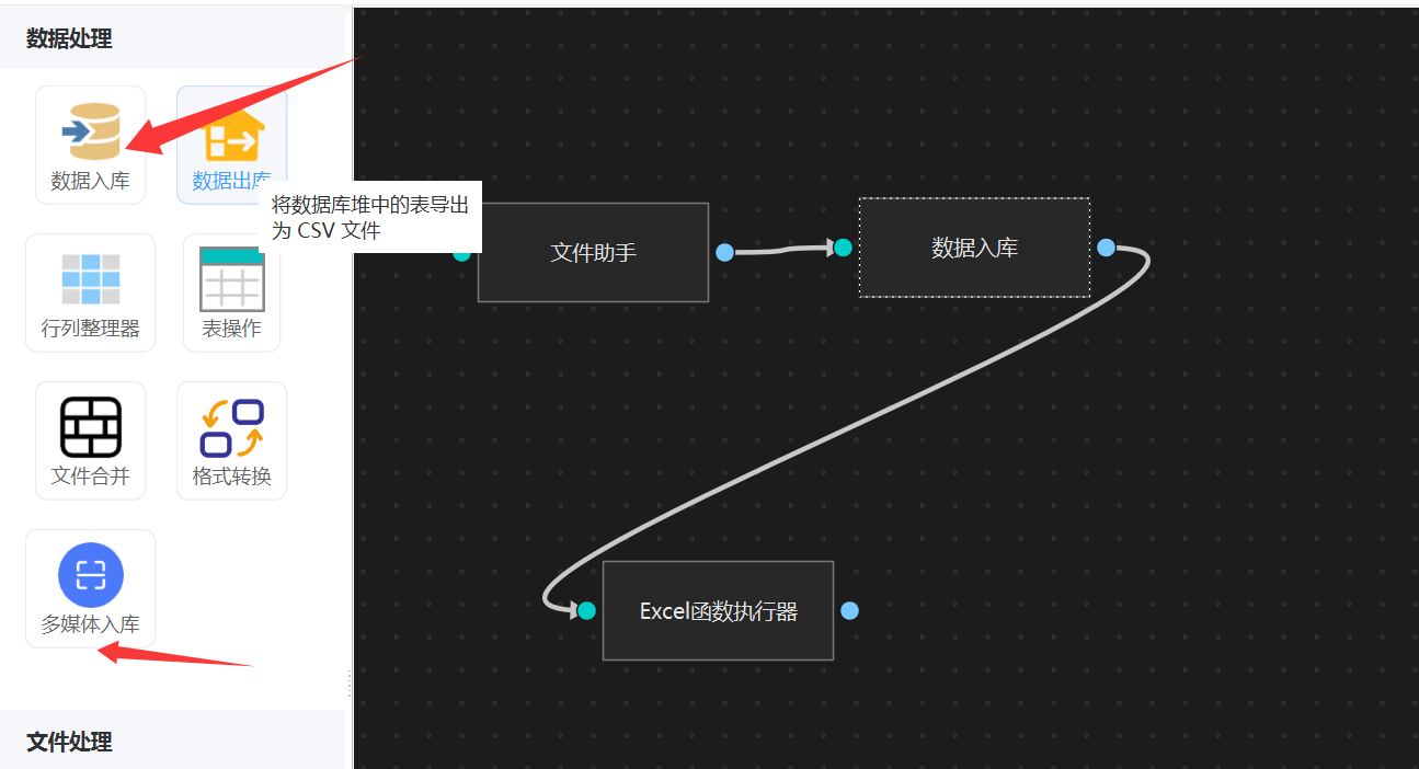 在工作流编辑界面中,位于左侧 「数据处理」 分类下的 「数据入库」 节点,即为目前支持的入库智能体。