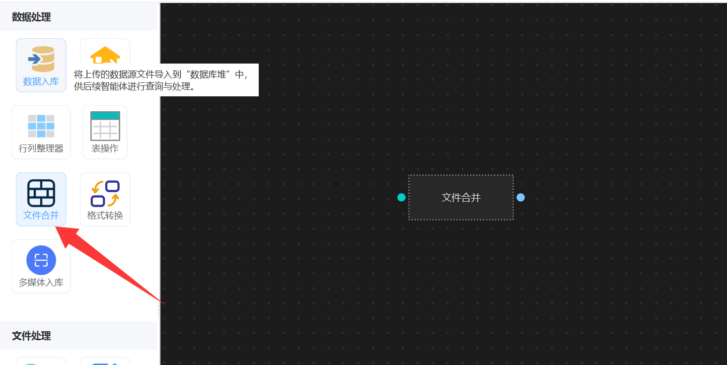 在工作流编辑界面中,位于左侧 「数据处理」 分类下的 「文件合并」 节点。如下图: