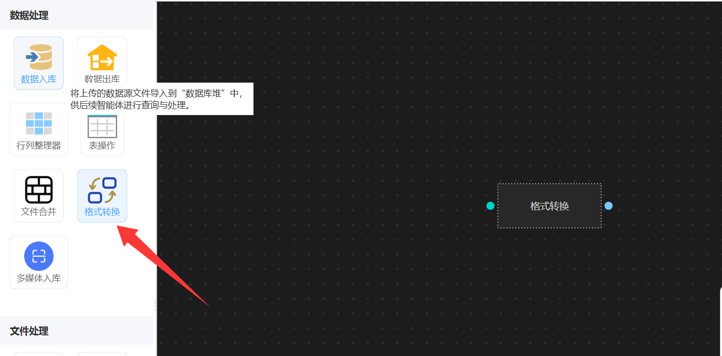 在工作流编辑界面中,位于左侧 「数据处理」 分类下的 「表操作」 节点。如下图: