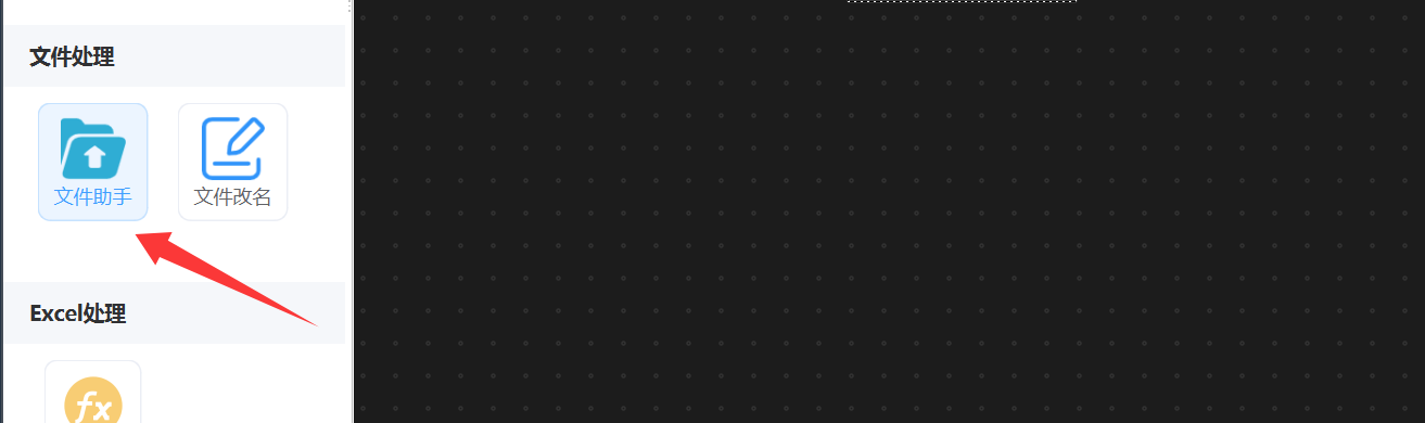 在工作流编辑界面中,位于左侧 「文件处理」 分类下的 「文件助手」 节点。如下图:
