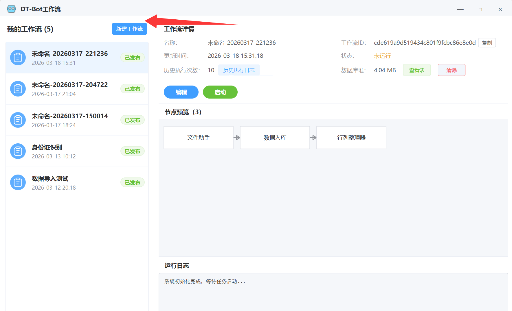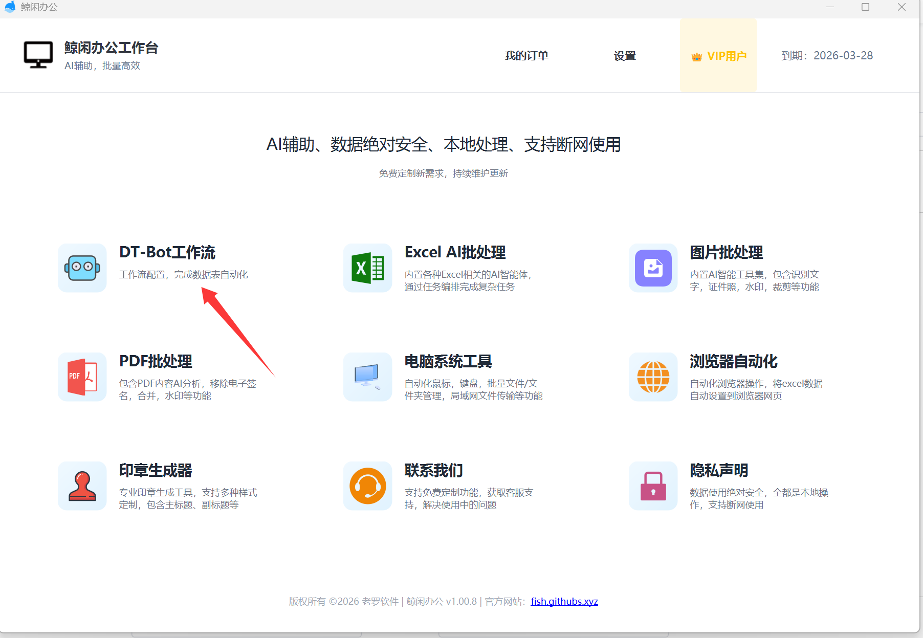 DT-Bot新建工作流很简单。在“鲸闲办公”软件主界面,找到“DT-Bot工作流”,如下图示: