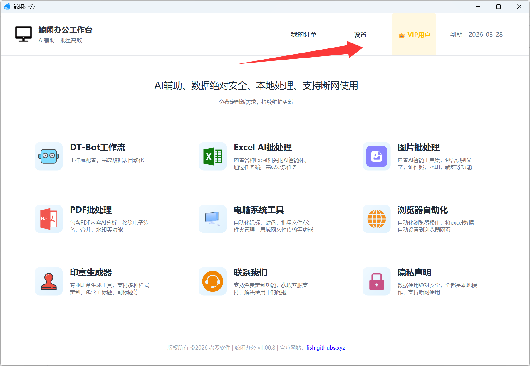 在“鲸闲办公”软件主界面,顶部找到“设置”,如下图: