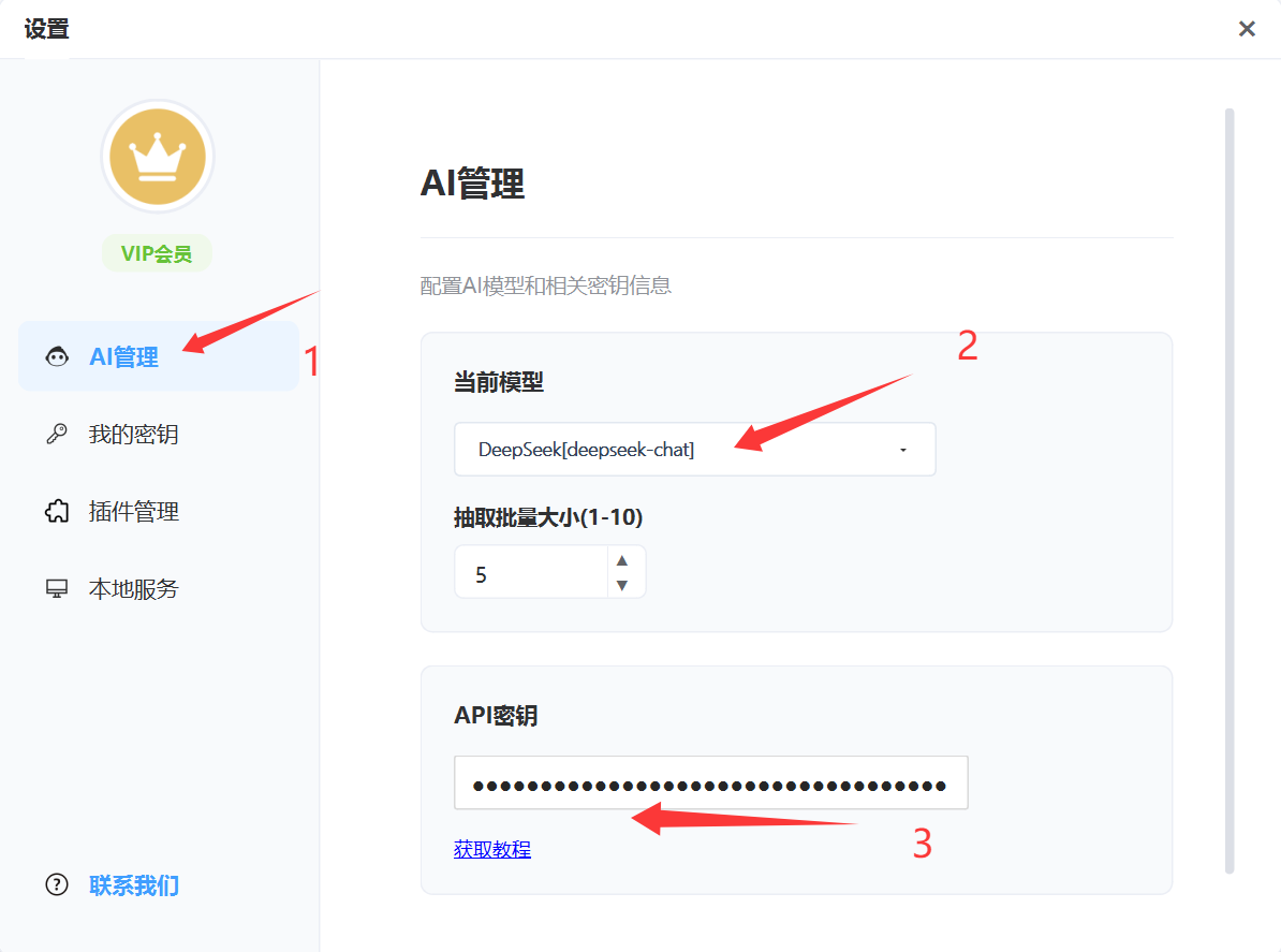 在设置面板中,找到 “AI管理”, 推荐选择“DeepSeek”模型,这个比较智能。然后填写API密钥,这个面板上有 获取教程。