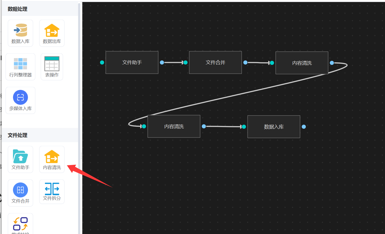 在工作流编辑界面中,位于左侧 「文件处理」 分类下的 「内容清洗」 节点。如下图: