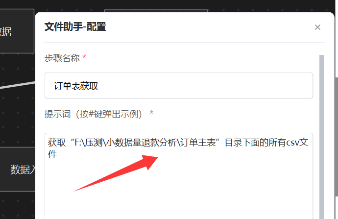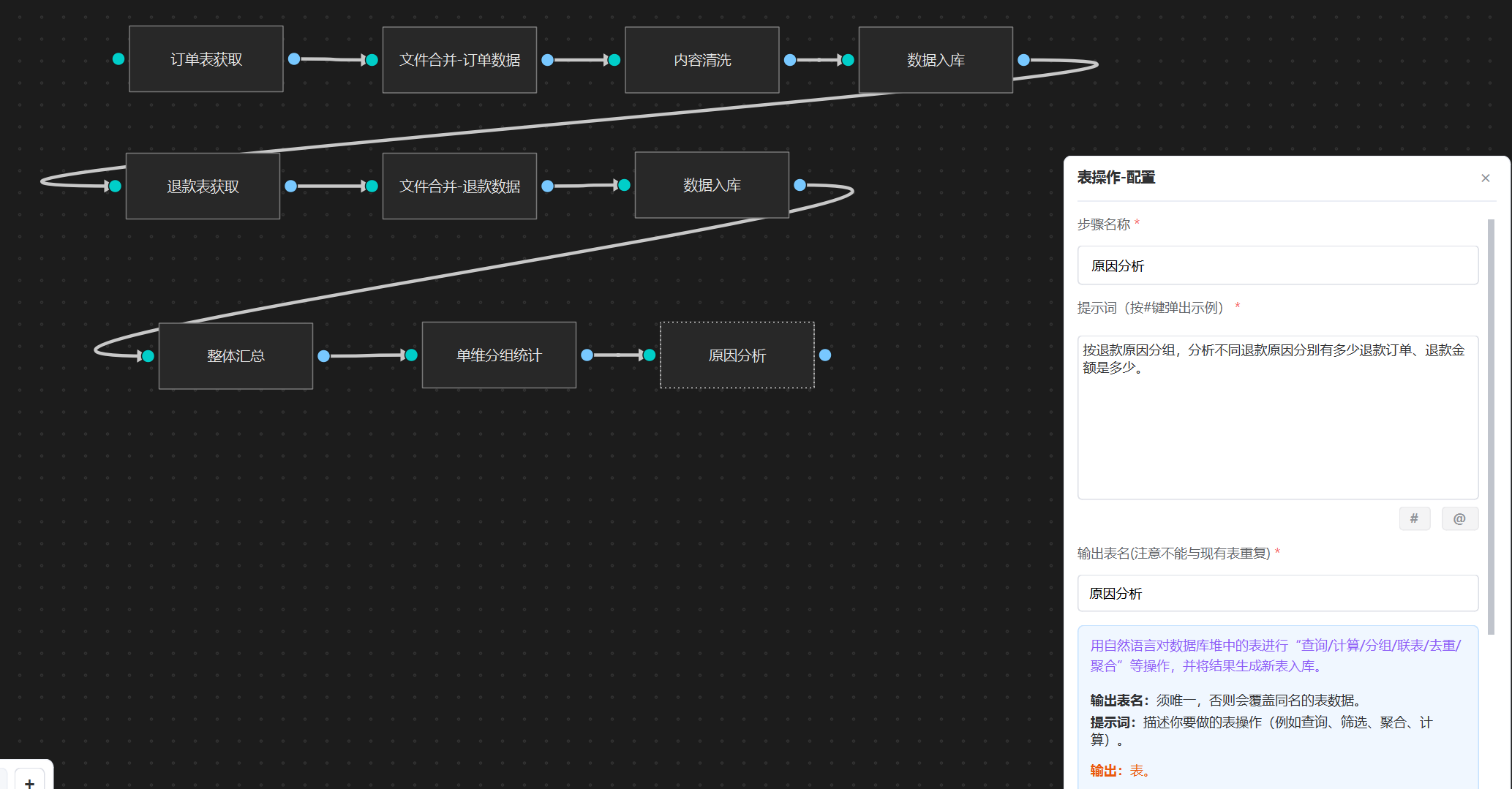 按退款原因分组,分析不同退款原因分别有多少退款订单、退款金额是多少。接着挂一个 “表操作”智能体,输入上面提示词,这样“原因分析”统计就配置好了。