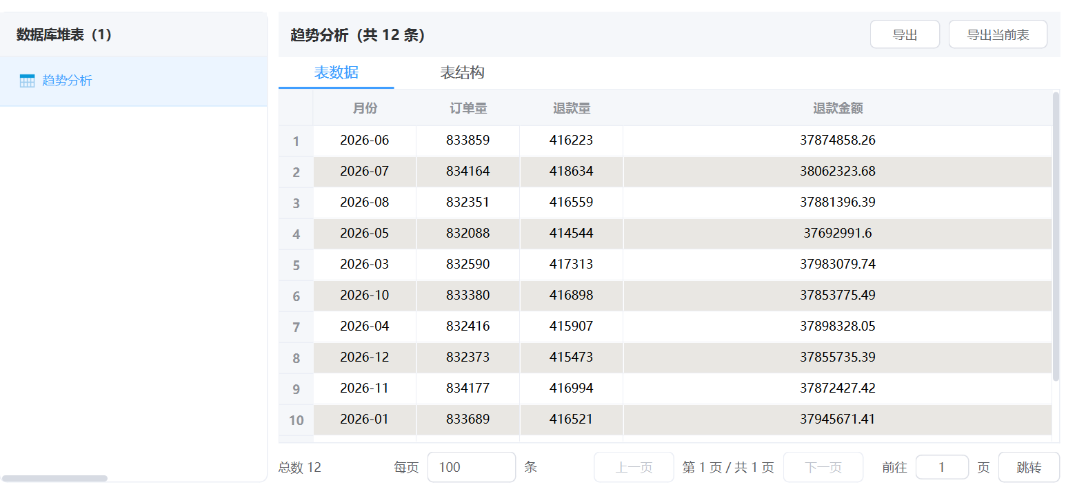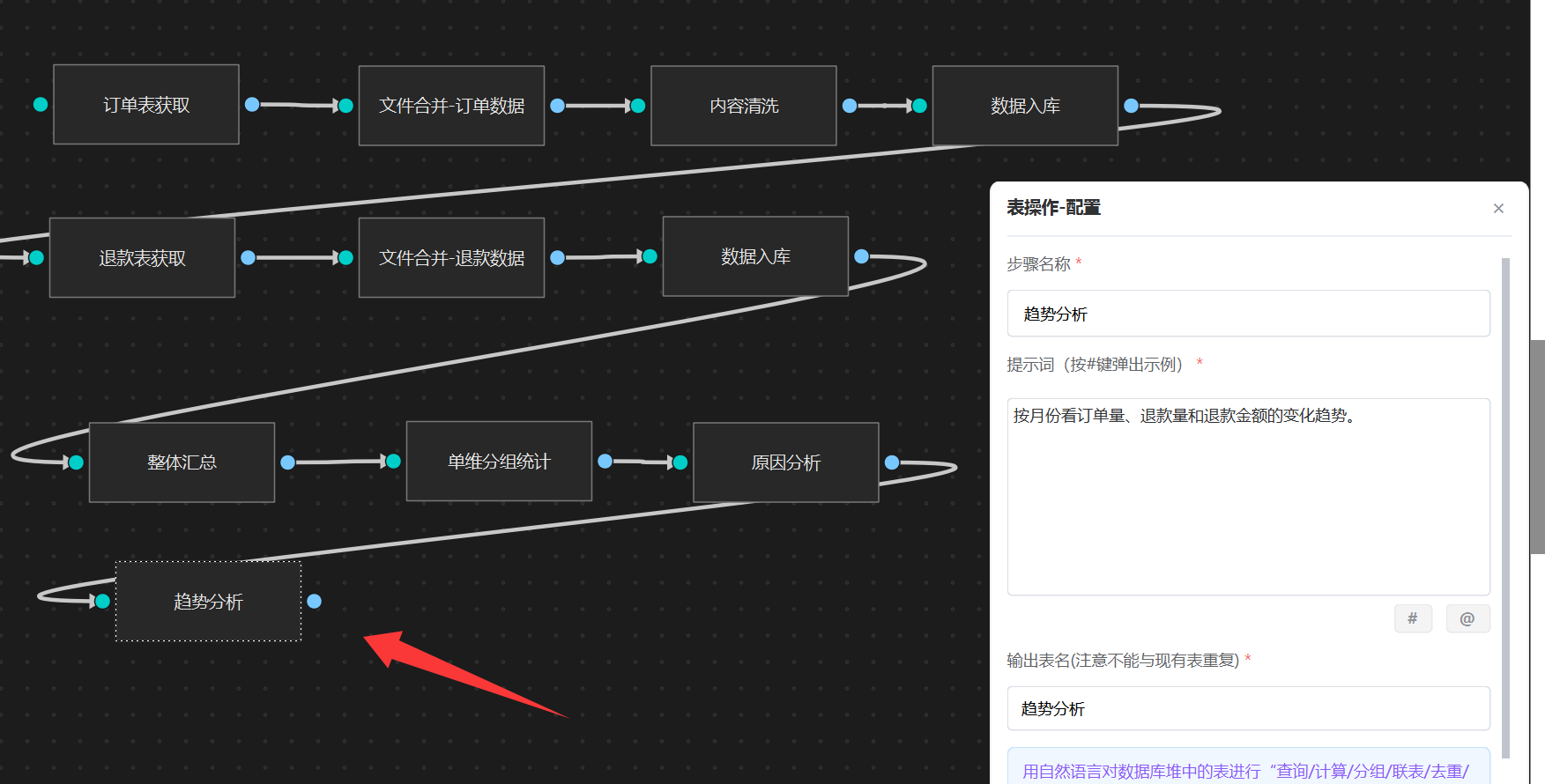 按月份看订单量、退款量和退款金额的变化趋势。接着挂一个 “表操作”智能体,输入上面提示词,这样“趋势分析”统计就配置好了。