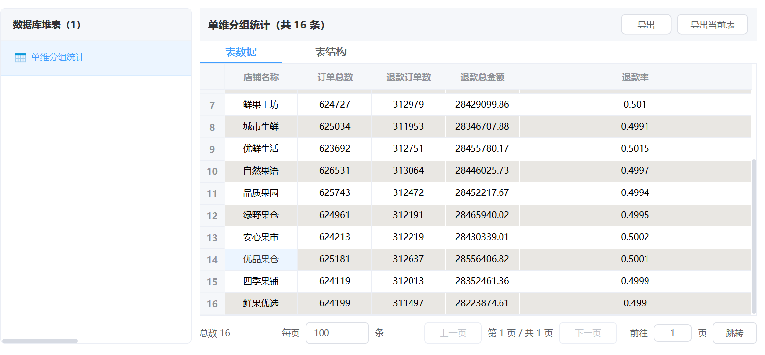2. 单维分组统计:按店铺名称分组,看看每个店铺的订单总数、退款订单数、退款率和退款总金额。