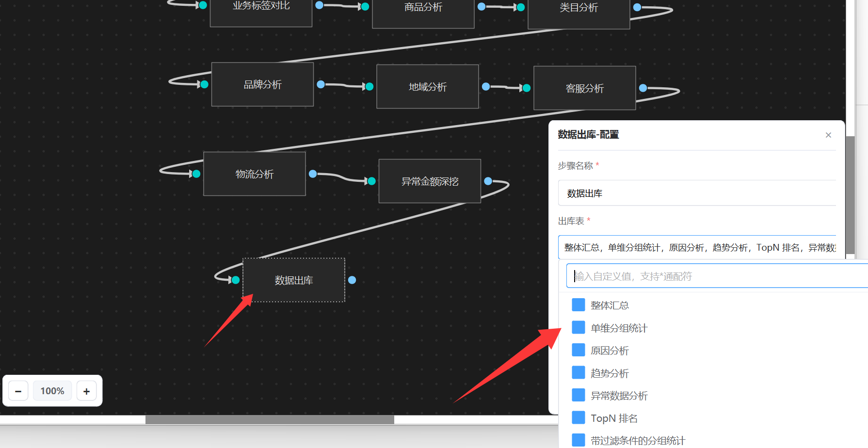 我们只需要在最后挂一个“数据出库”节点,然后选择要下载的表名称,如下图: