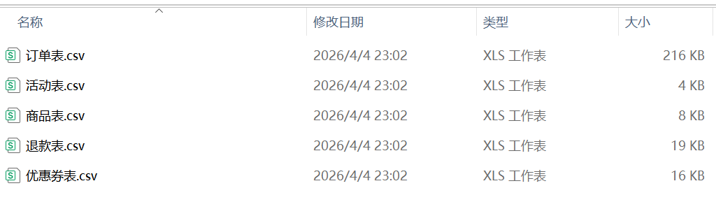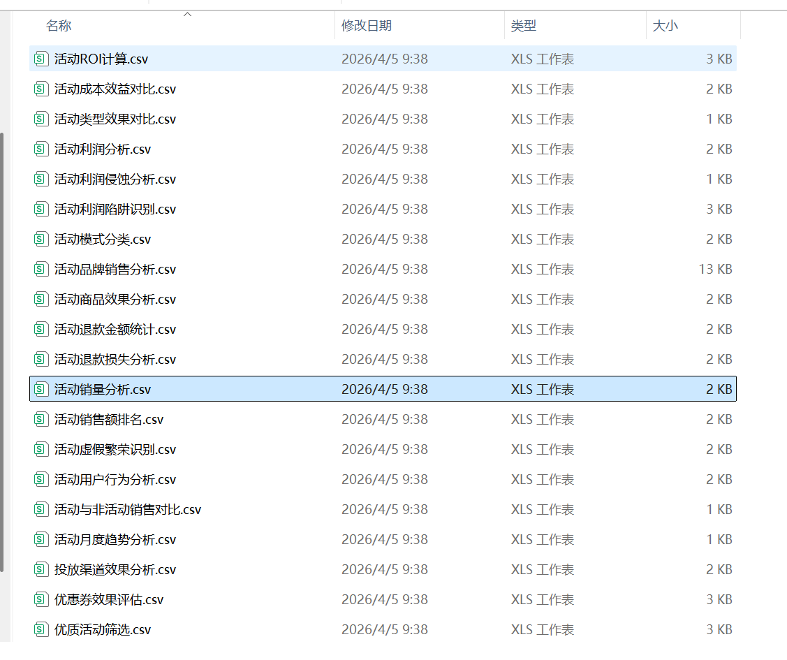 本次分析基于订单、活动、商品、退款、优惠券五张表,通过配置自动化工作流,完成了对电商活动投放效果的20项指标分析,涵盖销量、销售额、利润、ROI、退款损失、活动与非活动对比、渠道与类型效果、优惠券评估、利润陷阱识别及优质活动筛选等。数据经入库后,由多个“表操作”节点依次计算各项指标,最终将所有统计结果导出为文件,实现了从数据准备到多维分析、再到结果输出的全流程自动化。