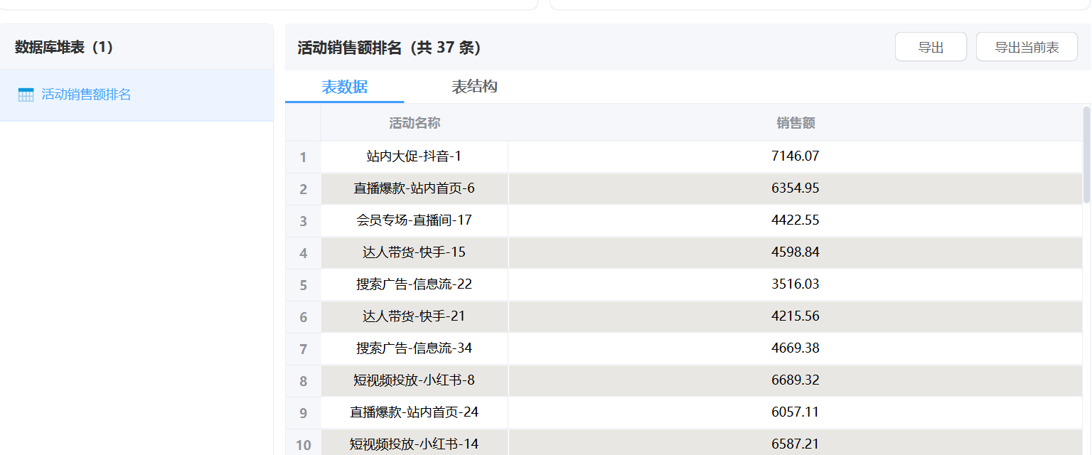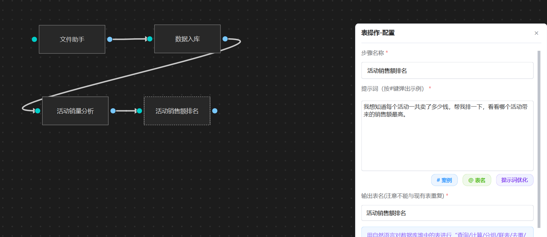 我想知道每个活动一共卖了多少钱,帮我排一下,看看哪个活动带来的销售额最高。直接挂一个 “表操作”智能体,输入上面提示词,这样“活动销售额排名”统计就配置好了。 注意,输出表名必须指定。