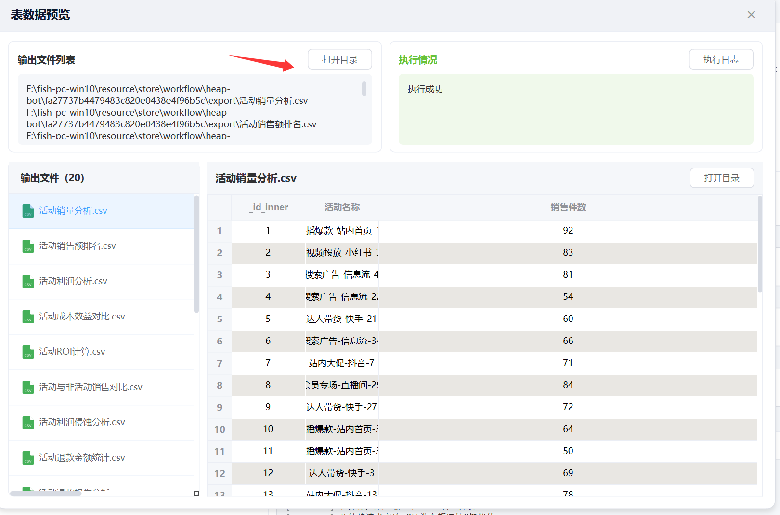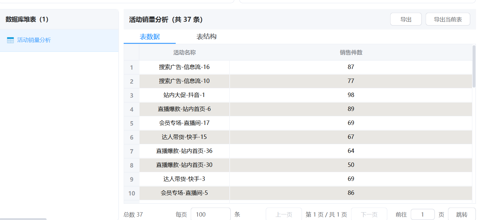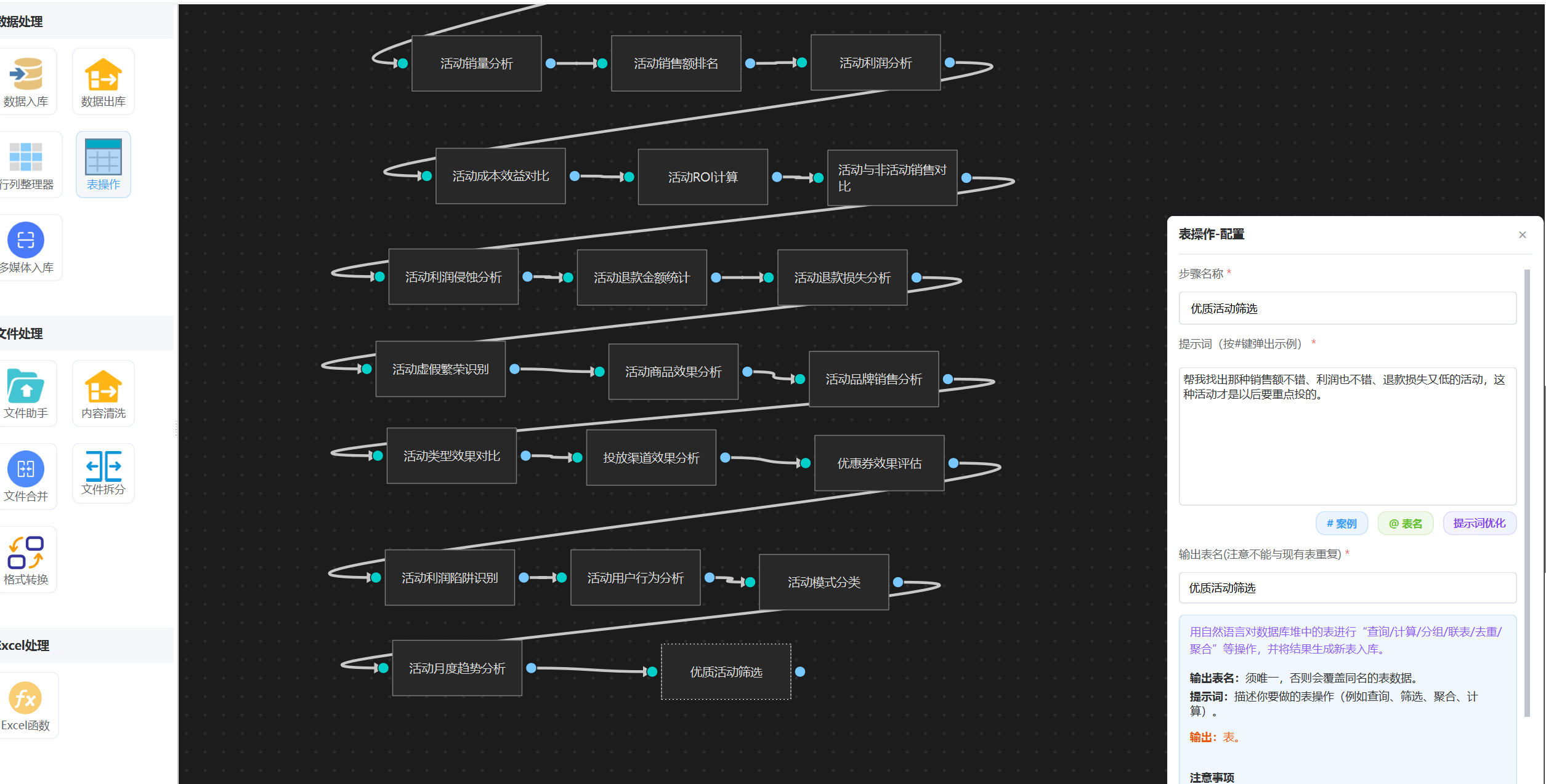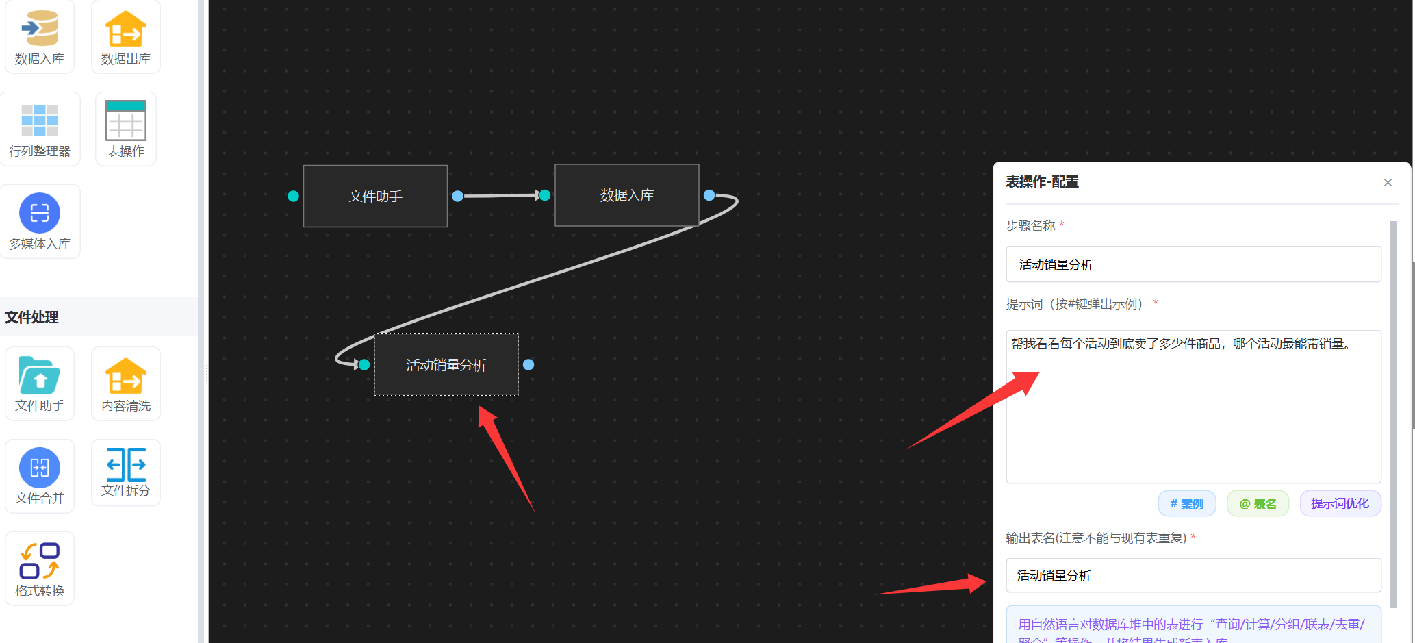 帮我看看每个活动到底卖了多少件商品,哪个活动最能带销量。直接挂一个 “表操作”智能体,输入上面提示词,这样“活动销量分析”统计就配置好了。 注意,输出表名必须指定。