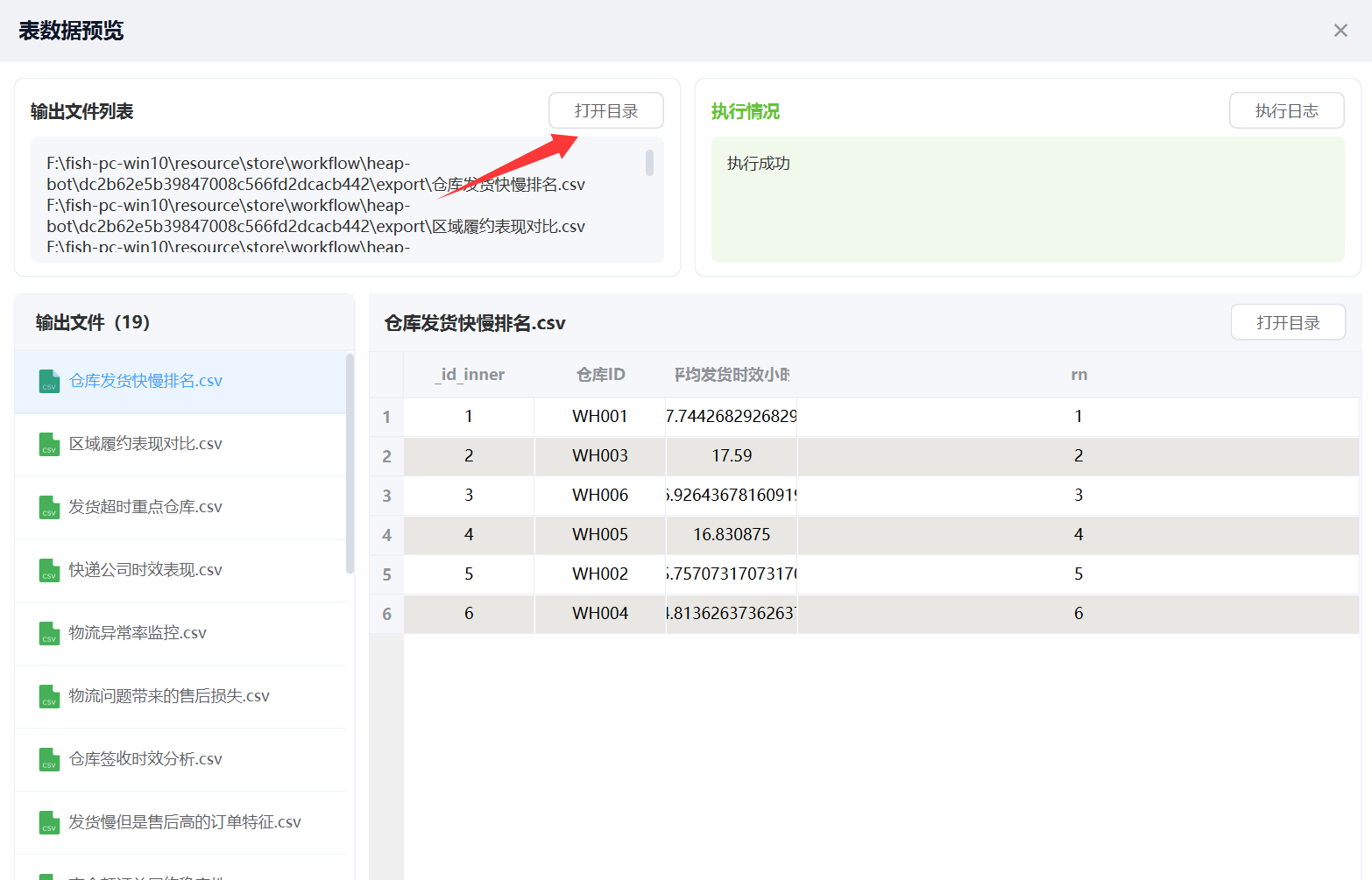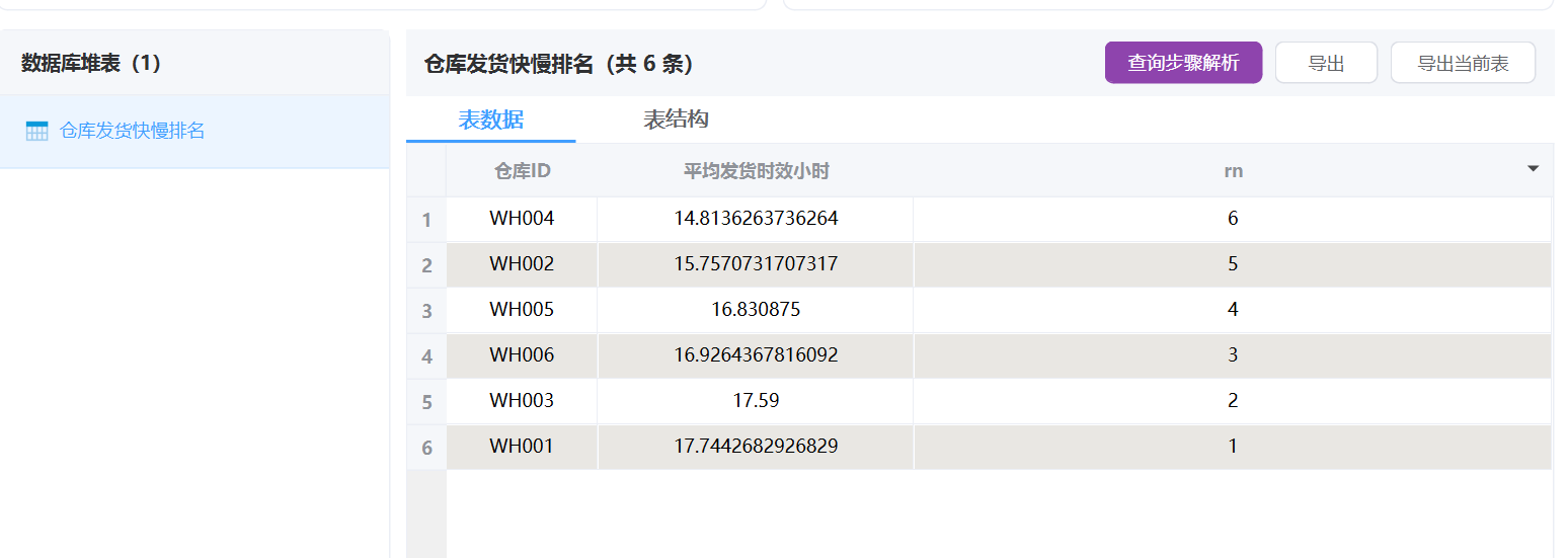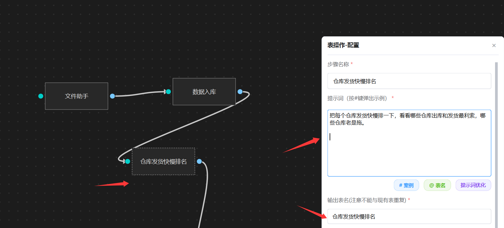 直接挂一个 “表操作”智能体,输入上面提示词,这样“仓库发货快慢排名”统计就配置好了。 注意,输出表名必须指定。