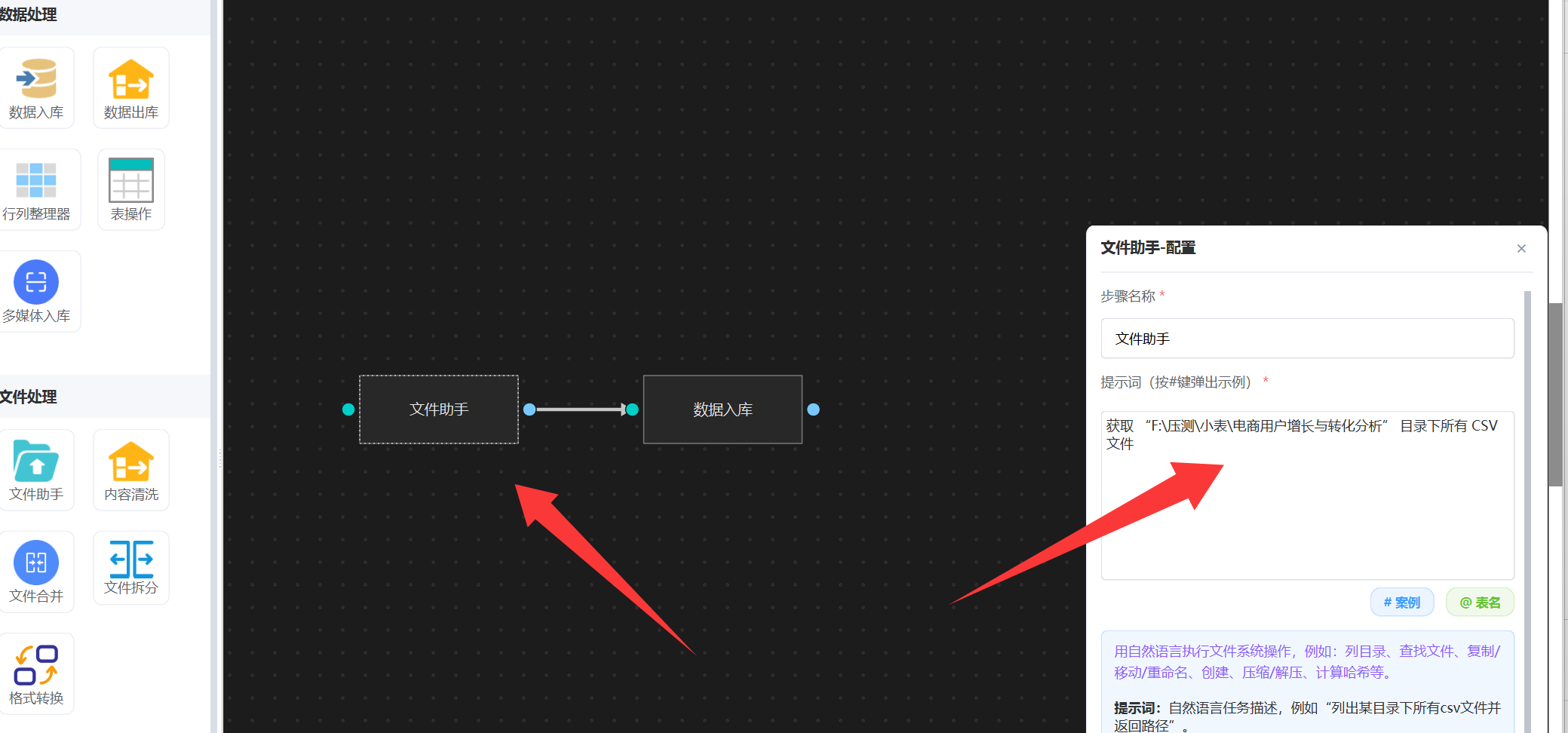 文件助手的提示词,描述数据csv文件的路径就可以了。