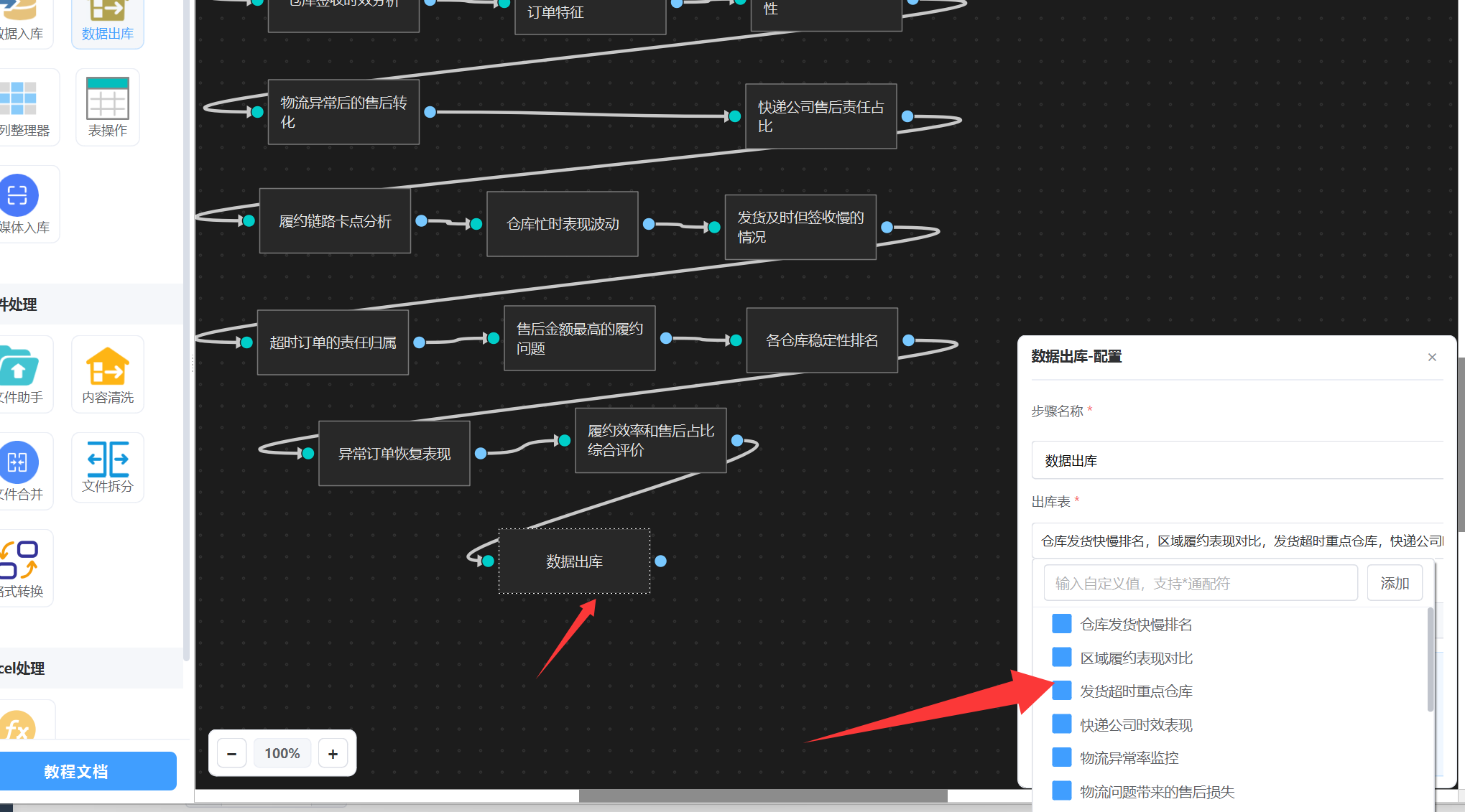 我们只需要在最后挂一个“数据出库”节点,然后选择要下载的表名称,如下图: