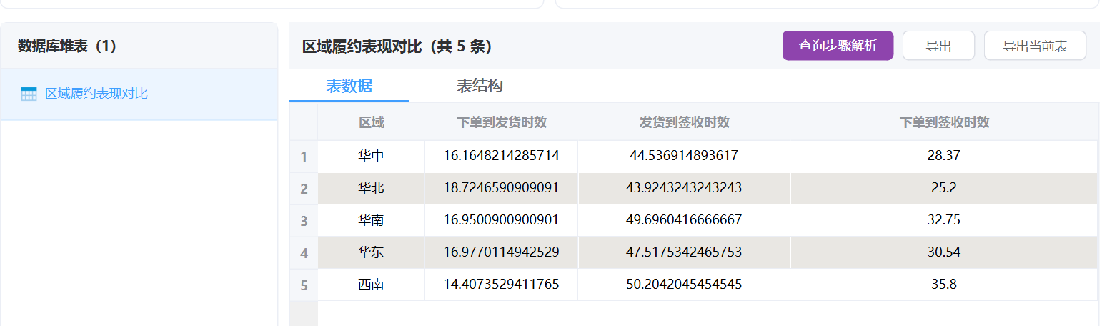 同上,我们新建一个“区域履约表现对比”节点。配置上面提示词。运行结果如图: