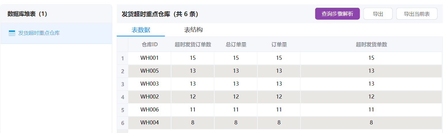 同上,我们新建一个“发货超时重点仓库”节点。配置上面提示词。运行结果如图: