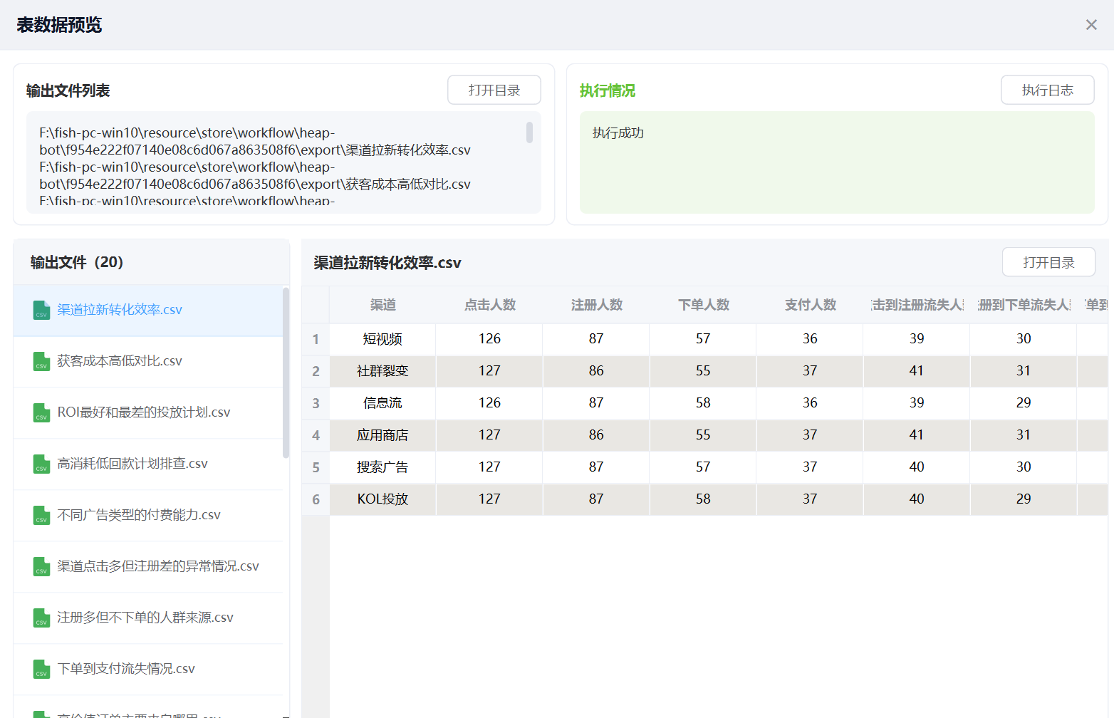 20. 渠道投放综合排名:把各个渠道的消耗金额、注册人数、下单人数、支付人数、支付金额和 ROI 一起摆出来,按综合效果排一遍,把该加钱的和该停掉的直接分出来。