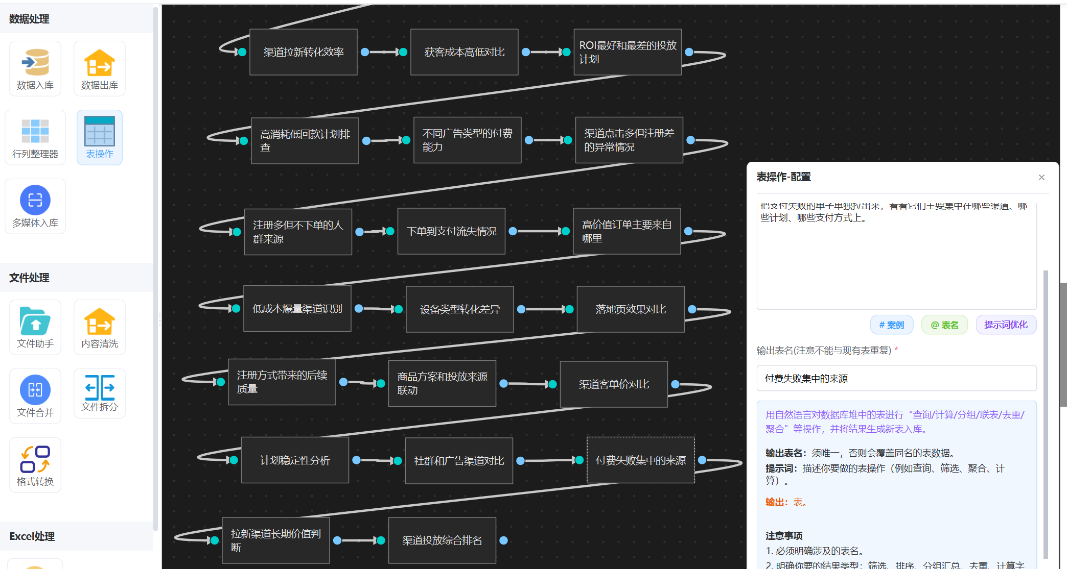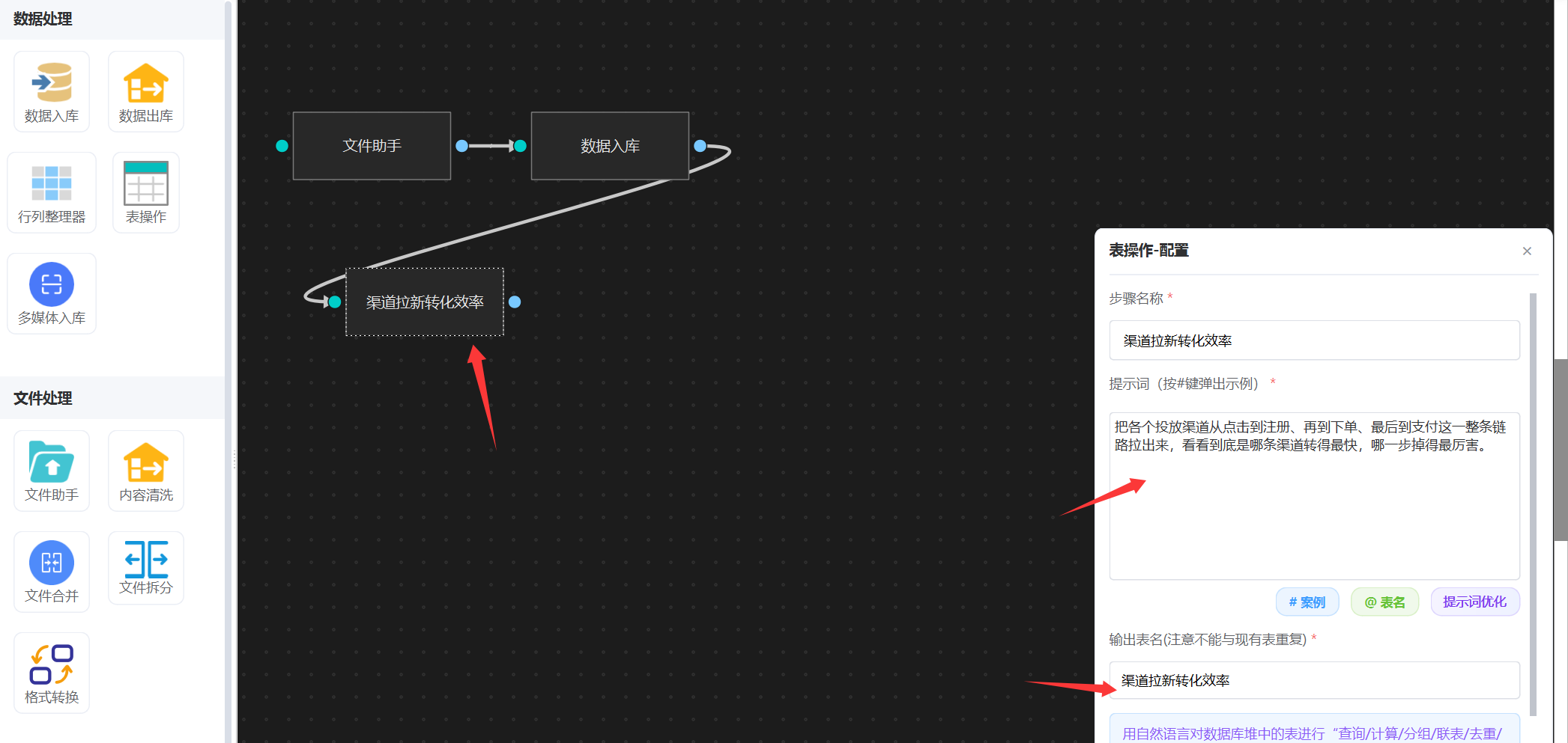 直接挂一个 “表操作”智能体,输入上面提示词,这样“渠道拉新转化效率”统计就配置好了。 注意,输出表名必须指定。
