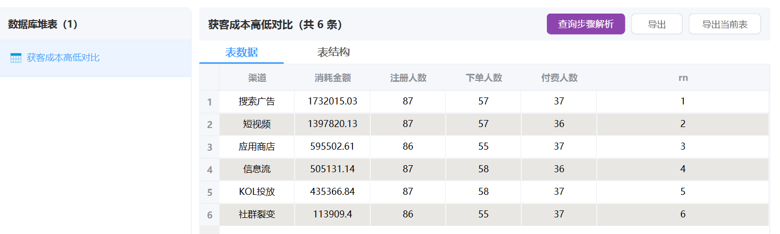 2. 获客成本高低对比:按渠道把花出去的钱和最后真正带来的注册人数、下单人数、付费人数放一起看,找出最贵的渠道和最划算的渠道。