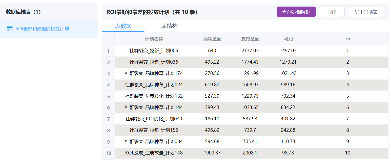 3. ROI最好和最差的投放计划:把每个投放计划花了多少钱、最后收回来多少钱一起排一下,看看哪些计划是真的赚钱,哪些计划纯烧钱。