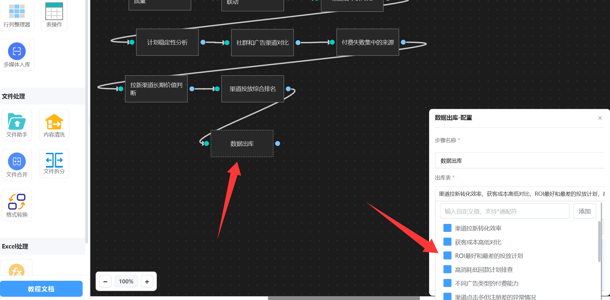 我们只需要在最后挂一个“数据出库”节点,然后选择要下载的表名称,如下图: