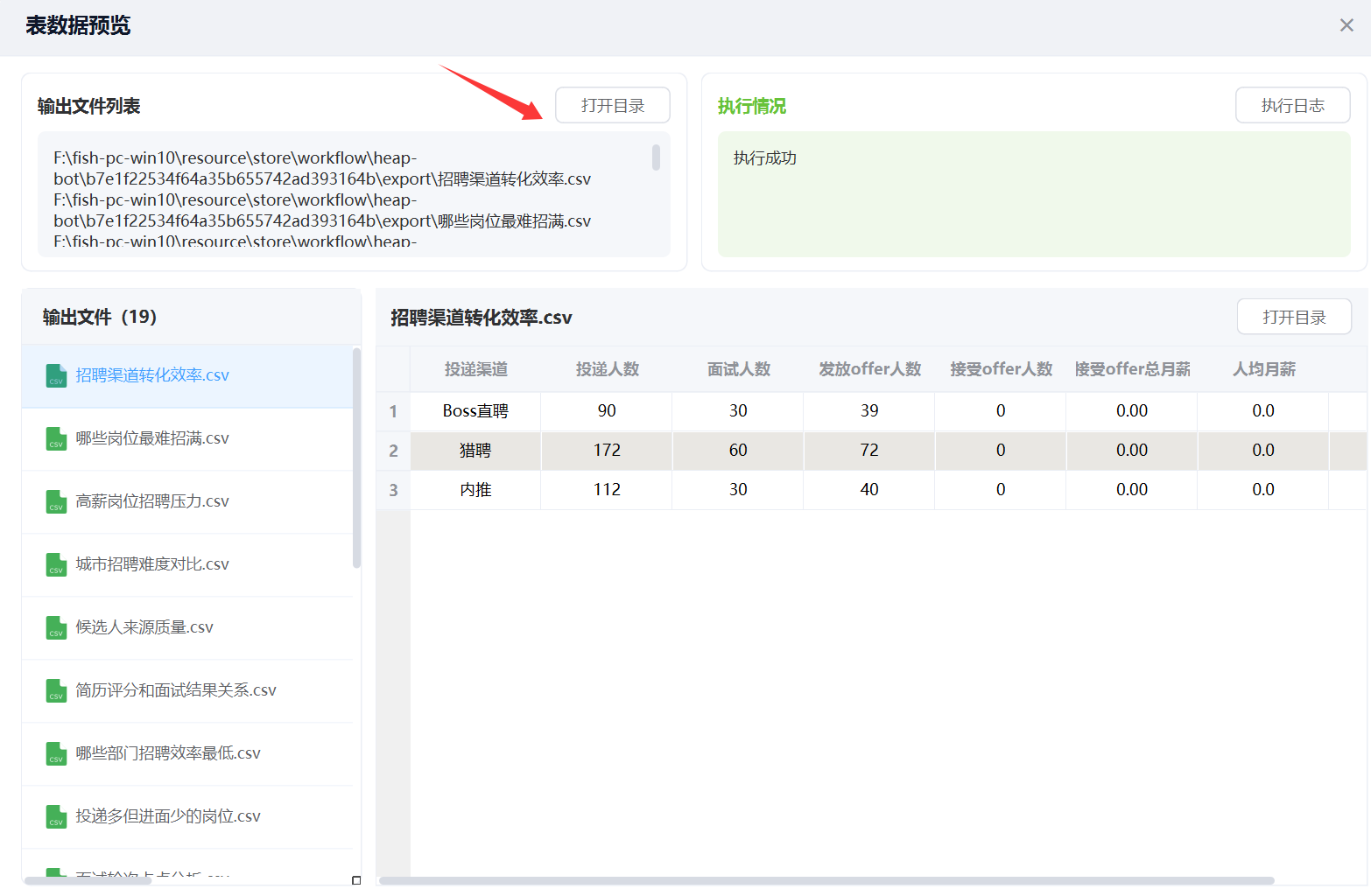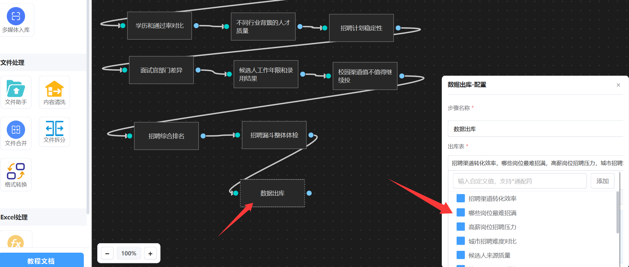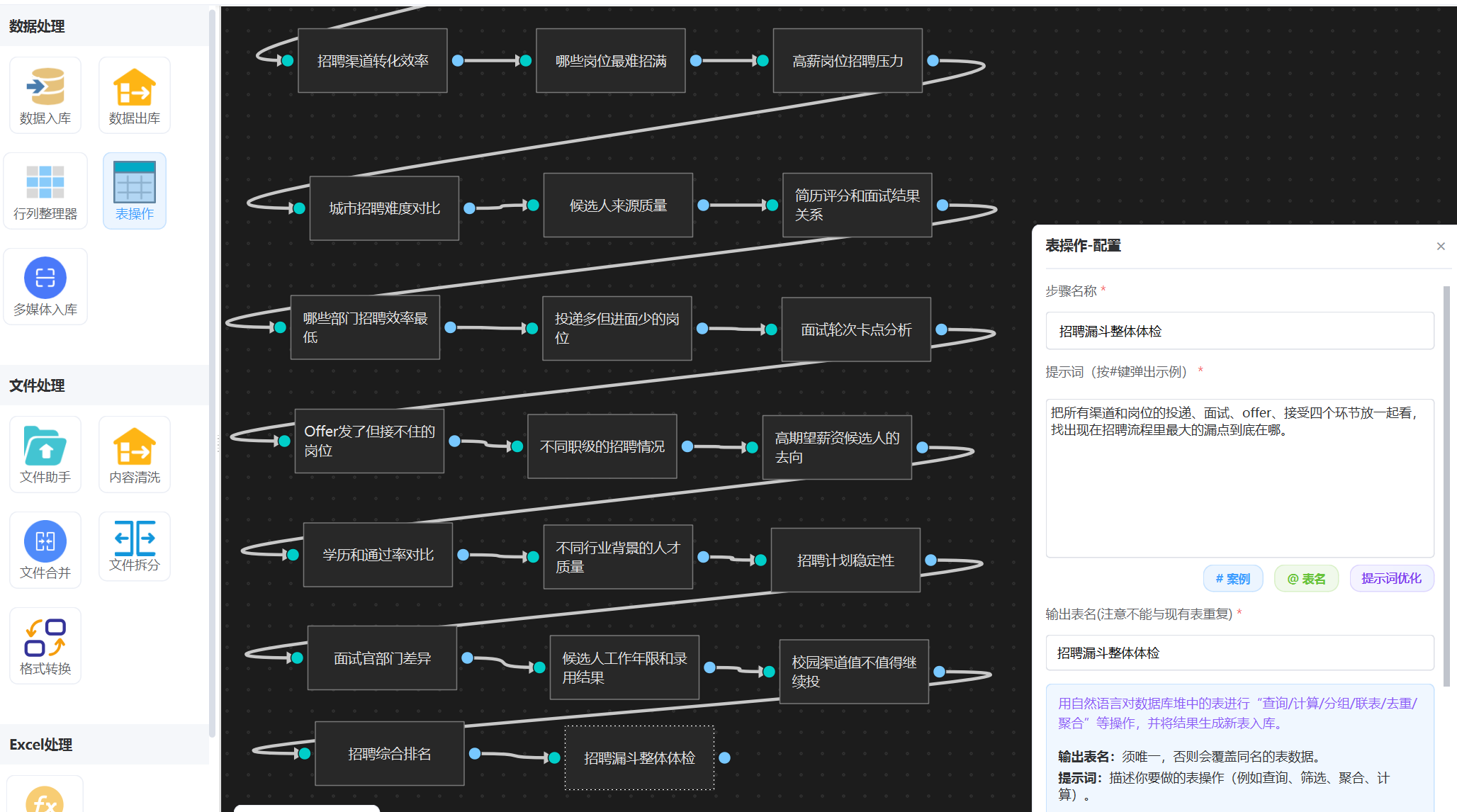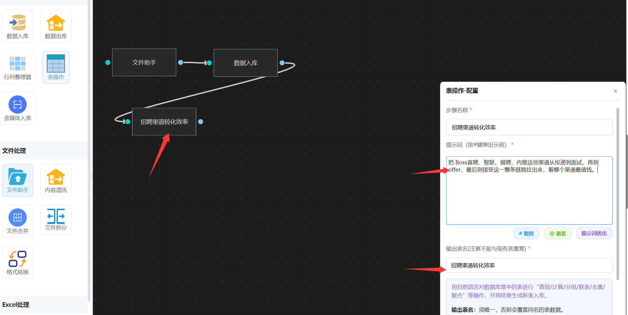 直接挂一个 “表操作”智能体,输入上面提示词,这样“招聘渠道转化效率”统计就配置好了。 注意,输出表名必须指定。