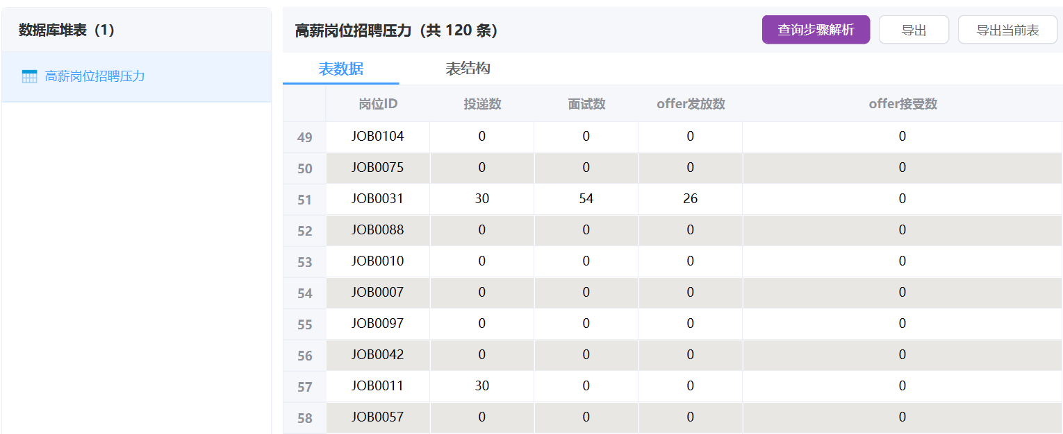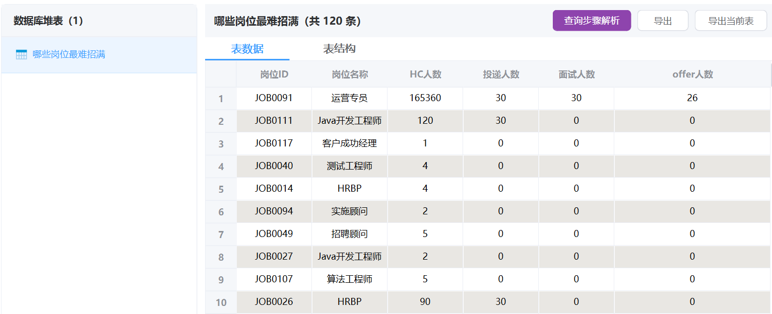 2. 哪些岗位最难招满:把各个岗位的 HC、投递人数、面试人数、offer人数放一起看,找出一直补不齐人的岗位。
