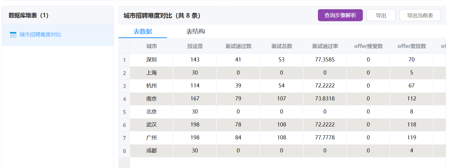 4. 城市招聘难度对比:按城市把投递量、面试通过率、offer接受率排一下,看看哪个城市最难招人。