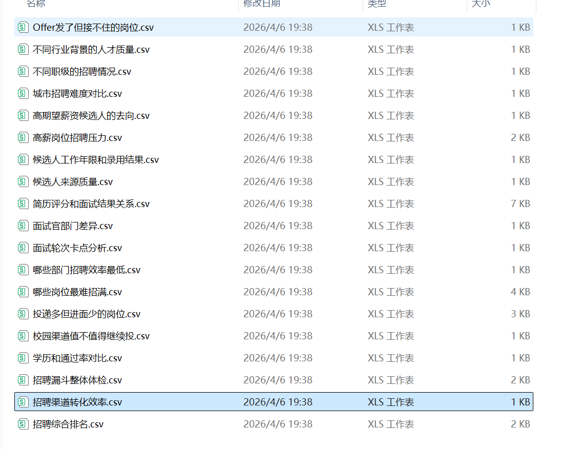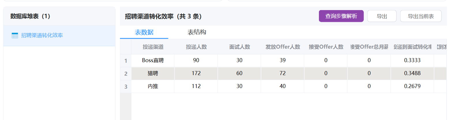 1. 招聘渠道转化效率:把 Boss直聘、智联、猎聘、内推这些渠道从投递到面试、再到 offer、最后到接受这一整条链路拉出来,看哪个渠道最值钱。