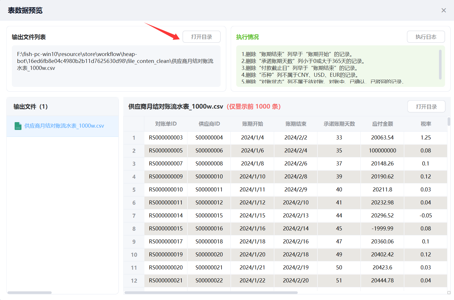 等执行完成后,我们预览清洗后的结果数据,还可以打开目录查看结果文件,如图: