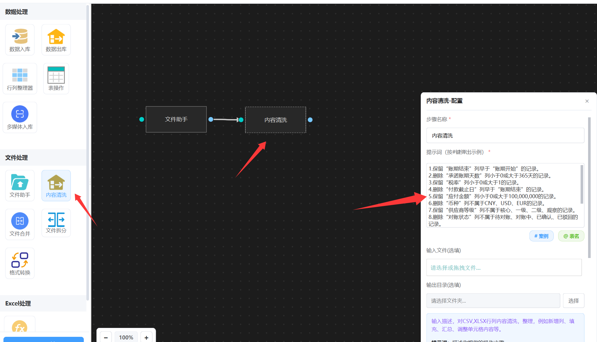 提示词描述你要清洗的所有步骤就可以了。 然后执行工作流。