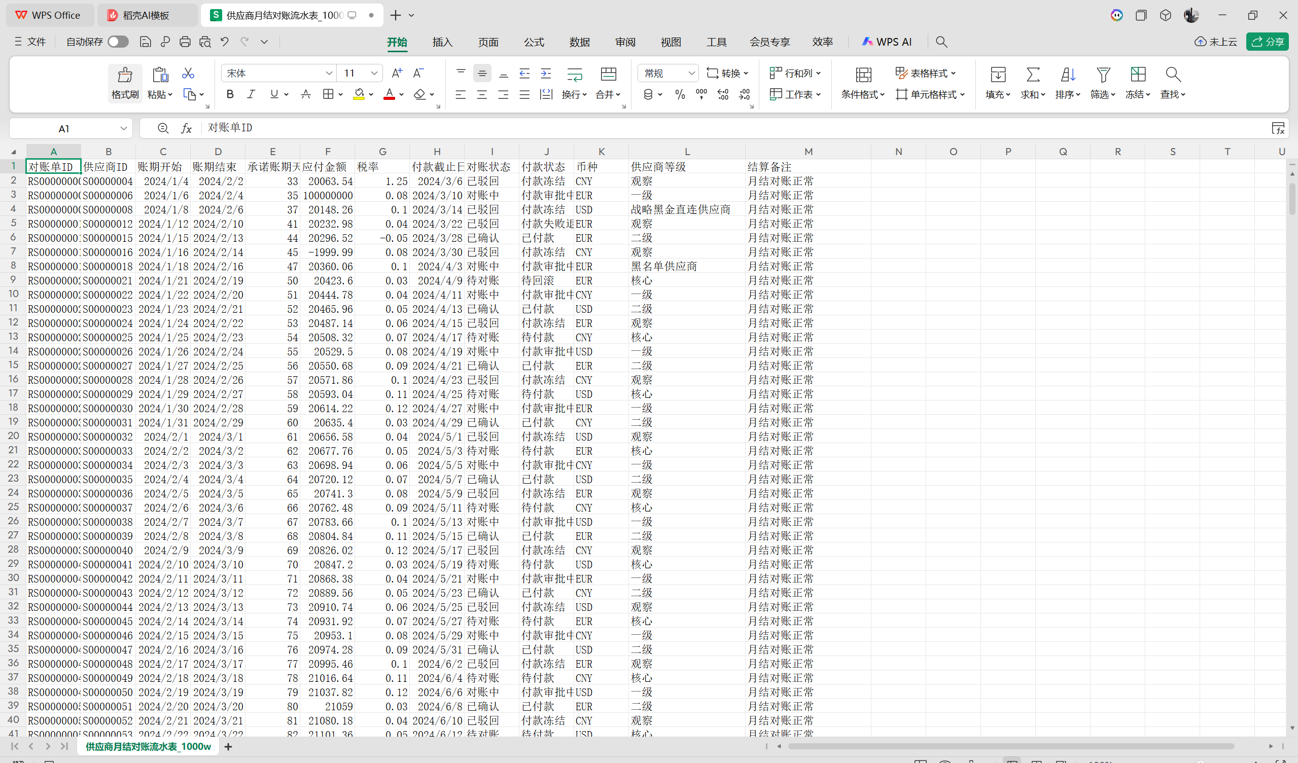 | 对账单ID | 供应商ID | 账期开始 | 账期结束 | 承诺账期天数 | 应付金额 | 税率 | 付款截止日 | 对账状态 | 付款状态 | 币种 | 供应商等级 | 结算备注 |