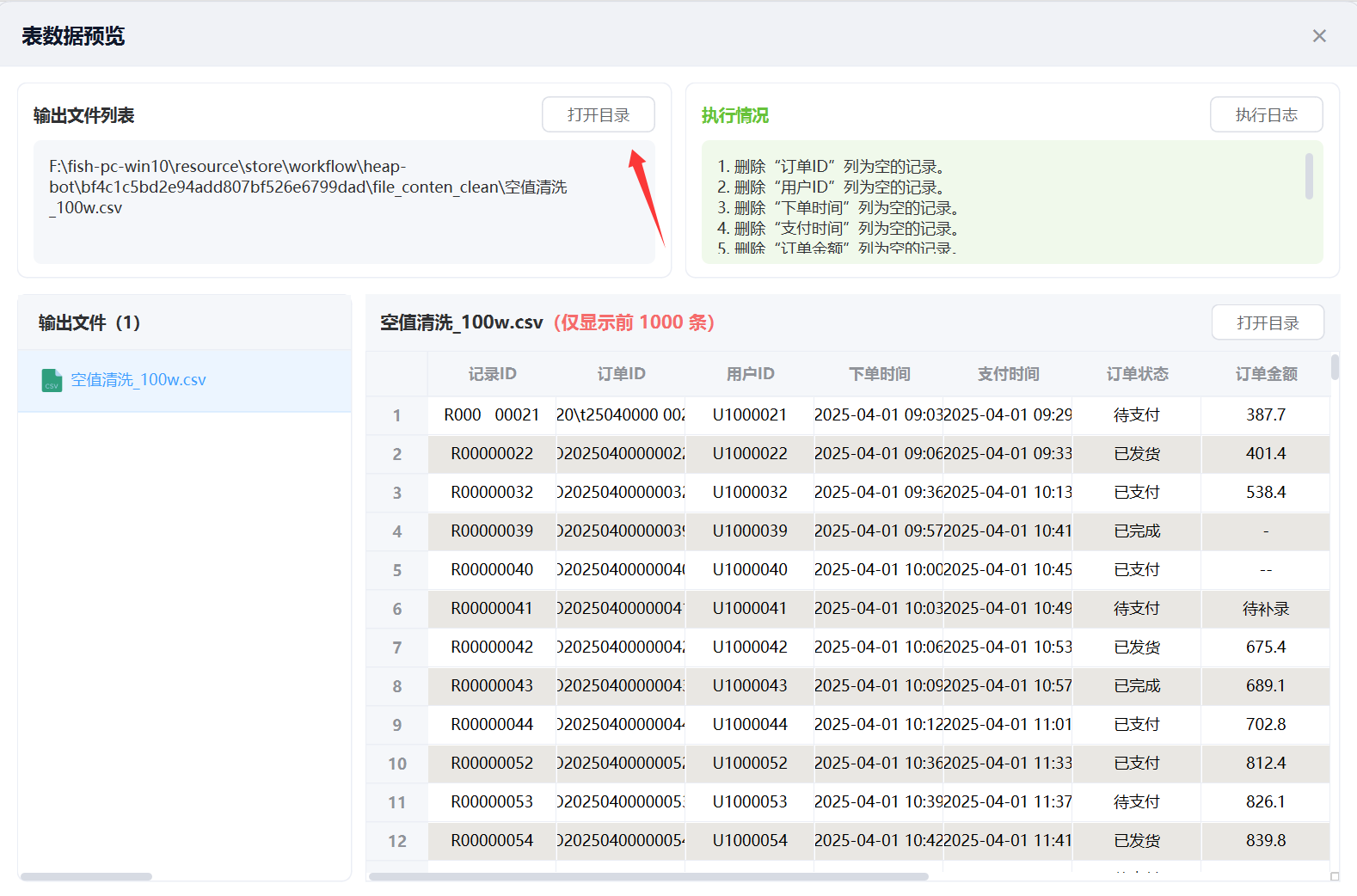 等执行完成后,我们预览清洗后的结果数据,还可以打开目录查看结果文件,如图: