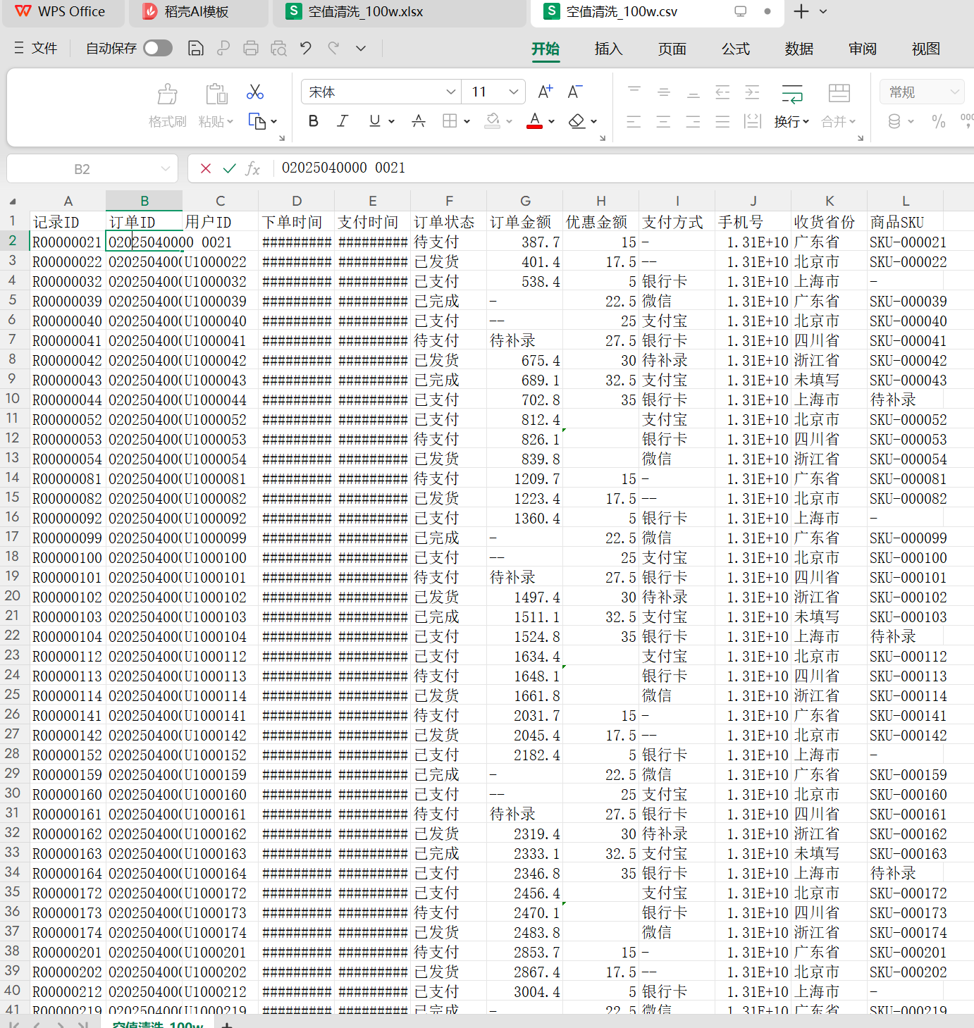 | 记录ID | 订单ID | 用户ID | 下单时间 | 支付时间 | 订单状态 | 订单金额 | 优惠金额 | 支付方式 | 手机号 | 收货省份 | 商品SKU |