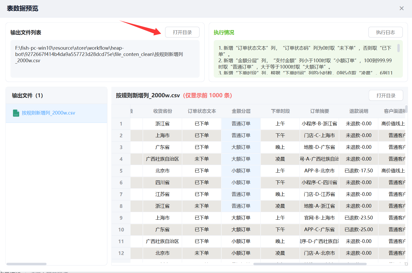 等执行完成后,我们预览清洗后的结果数据,还可以打开目录查看结果文件,如图: