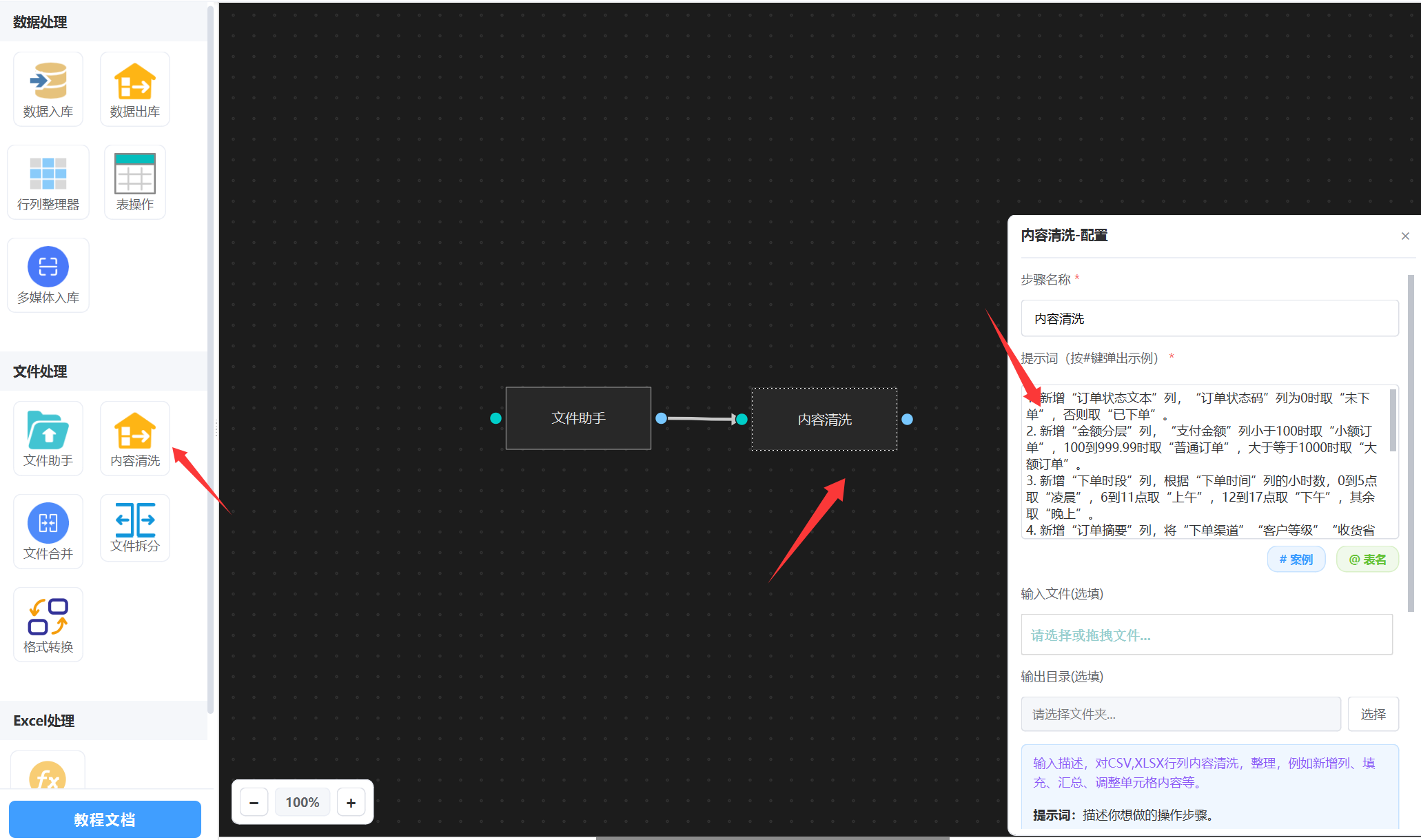 提示词描述你要清洗的所有步骤就可以了。 然后执行工作流。