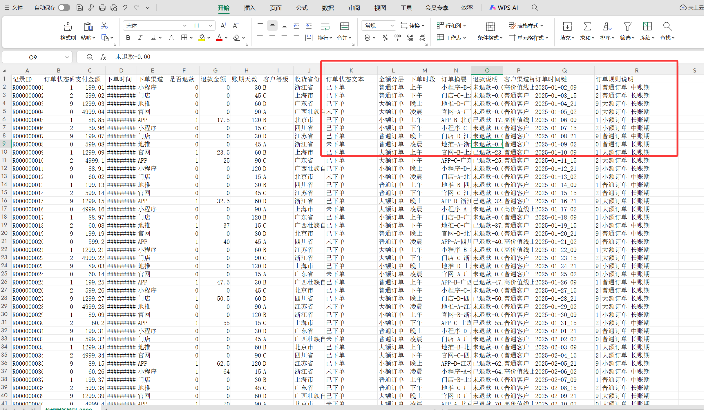 | 记录ID | 订单状态码 | 支付金额 | 下单时间 | 下单渠道 | 是否退款 | 退款金额 | 账期天数 | 客户等级 | 收货省份 |